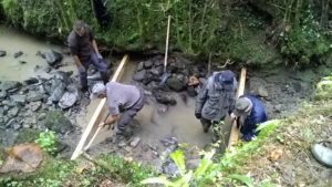 Les crues assez violentes de l’Ouzom ont creusé son lit au niveau de sa confluence avec le Milaa et le dénivelé plus important ne permettait plus aux truites d’accéder à leurs frayères. En octobre 2021, les bénévoles de l’association ont réaménagé le seuil en garnissant les bordures de cailloux, en les recouvrant de 5m3 de béton et en fixant 5 planches afin de réaliser des petites marches permettant aux truites d’atteindre les frayères du Milaa pour leur reproduction.
